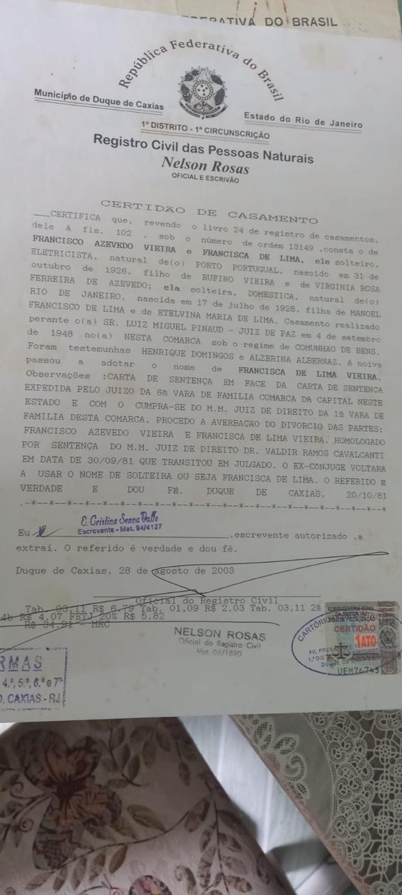 Tenho também a identidade, emitida pelo Felix Pacheco, mas emitida após o casamento.