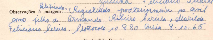 Não sei se tem relação com essa anotação no batismo que fala algo sobre "registrado posteriormente como filho de...":
