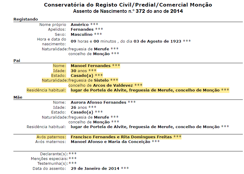 • Américo Fernandes: Nascido em 03/08/1923, às 09:00, na freguesia de Merufe, concelho de Monção, Portugal. Pais confirmados: Manoel Fernandes e Aurora Afonso Fernandes. Faleceu em 10/03/2015 em Campo Grande/MS, Brasil.
