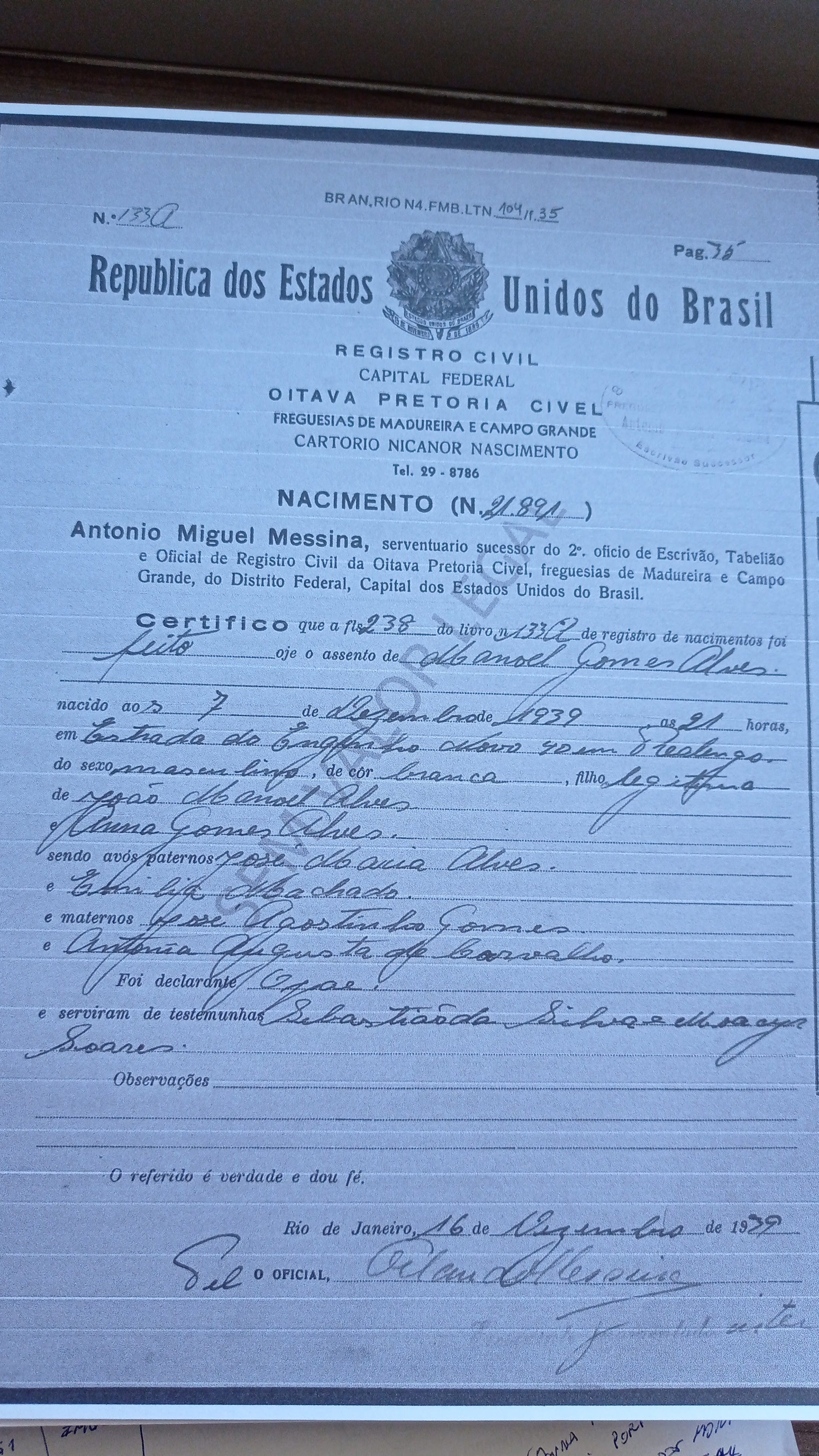 meu PAI: MANOEL GOMES ALVES, (já tenho a certidão de nascimento), nascido 07-12-1939, registro da 8ª PRETORIA CIVIL, NASCIMENTO NÚMERO 21.891, FLS 238 do LIVRO 133A; FILHO DE :