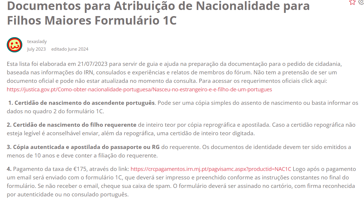 Sobre os documentos para solicitar o pedido de cidadania como filho maior (modelo 1C)
