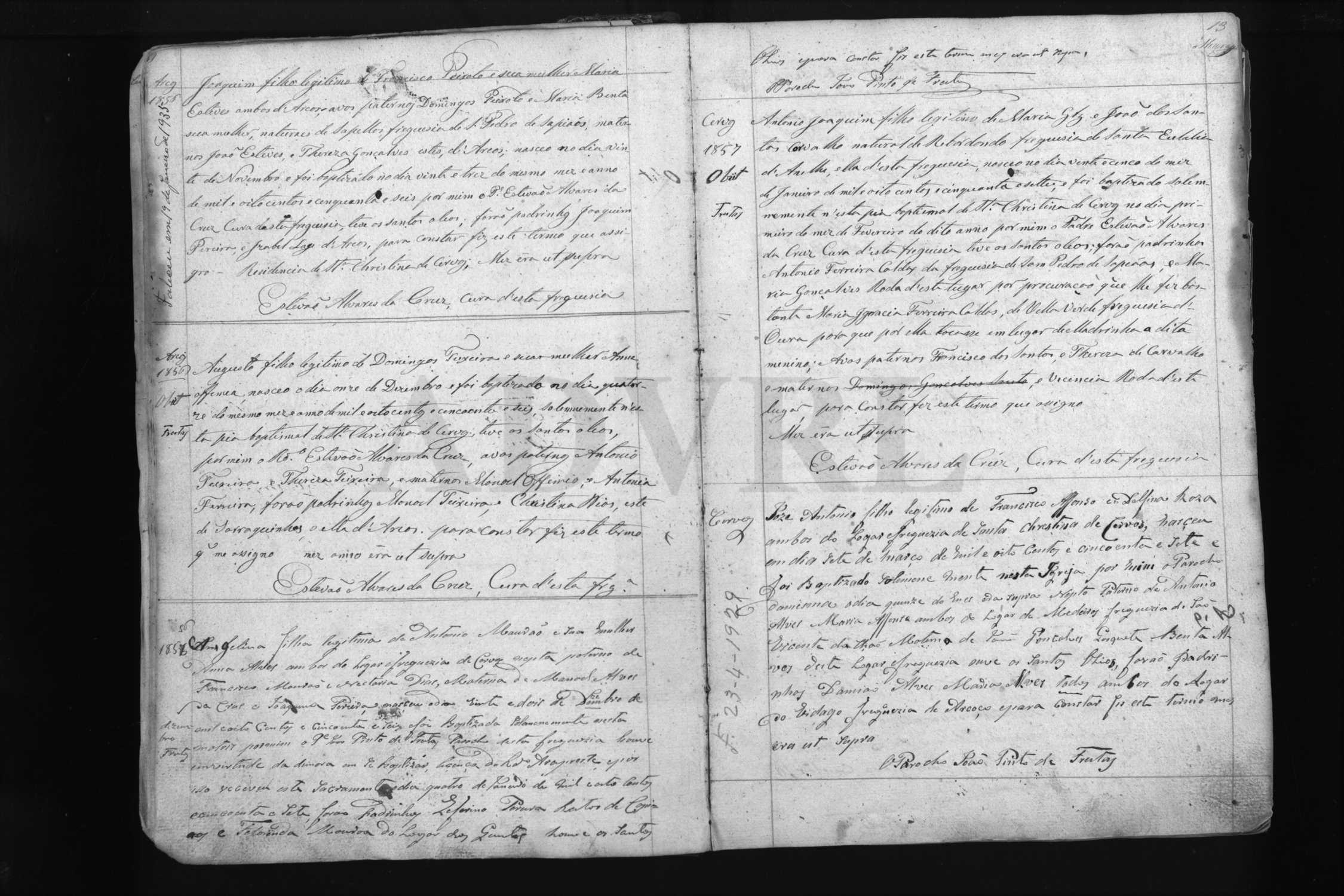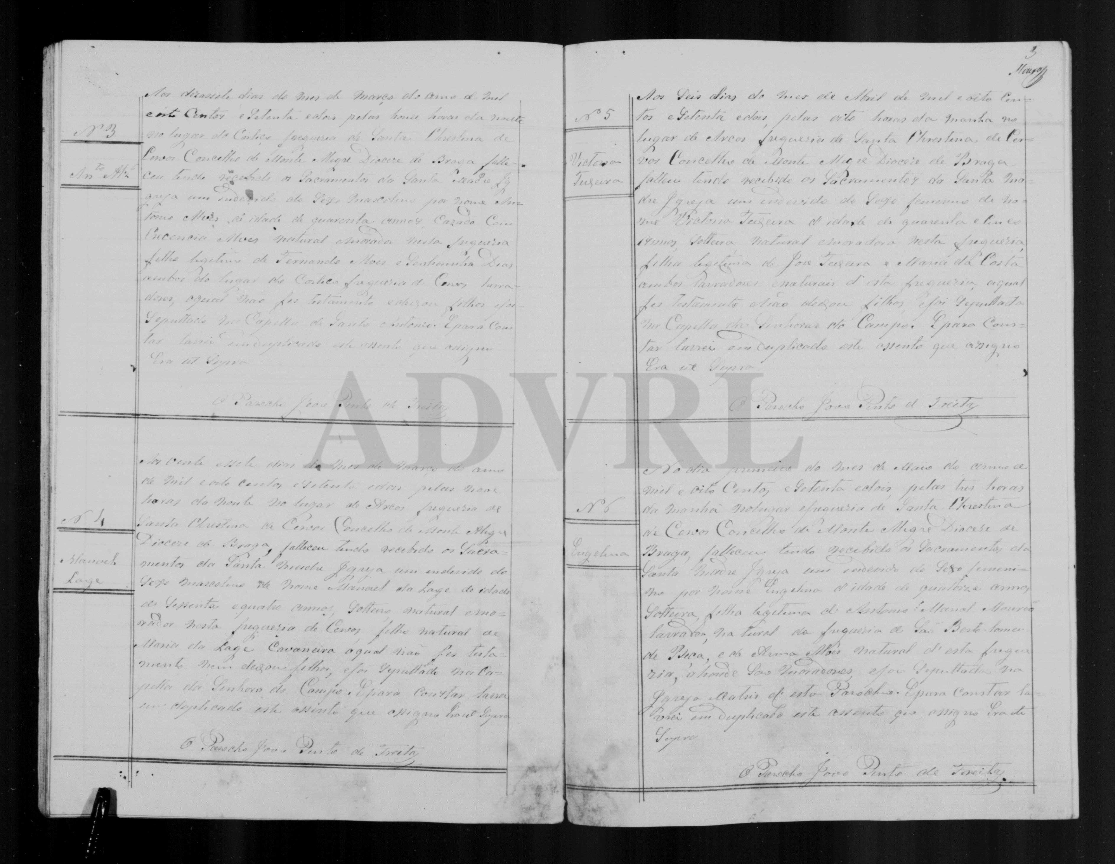 No dia primeiro do mes de Maio do anno de mil oito centos e setenta e dois, pelas tres horas da manhã, no lugar e freguesia de Santa Christina de Cervos, Concelho de Monte Alegre, Diocese de Braga, falleceu tendo recebido os sacramentos da Santa Madre Igreja um individuo do sexo feminino por nome Engelina d'idade de quatorze annos, solteira, filha legitima de Antonio Manoel Mourão lavrador, natural da freguesia de São Bartolomeu de Beça, e de Anna Alves natural d'esta freguesia, ahonde são [? recebidos? fregueses?], e foi sepultada na Igreja Matriz d'esta Parochia. E para constar lavrei em duplicado este assento que assigno. Era ut supra.