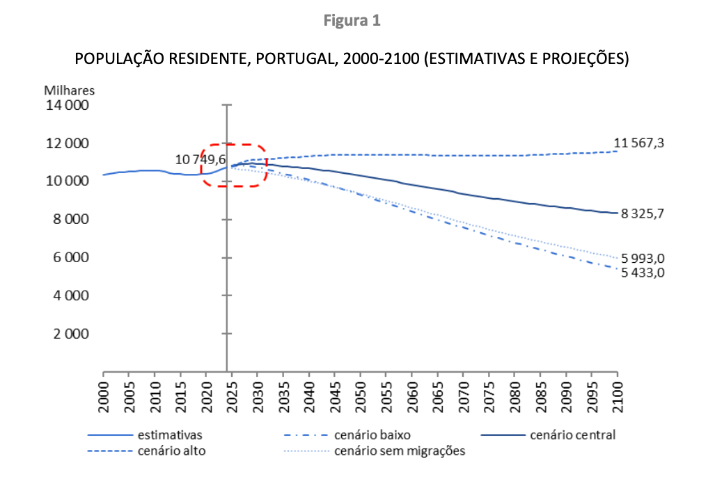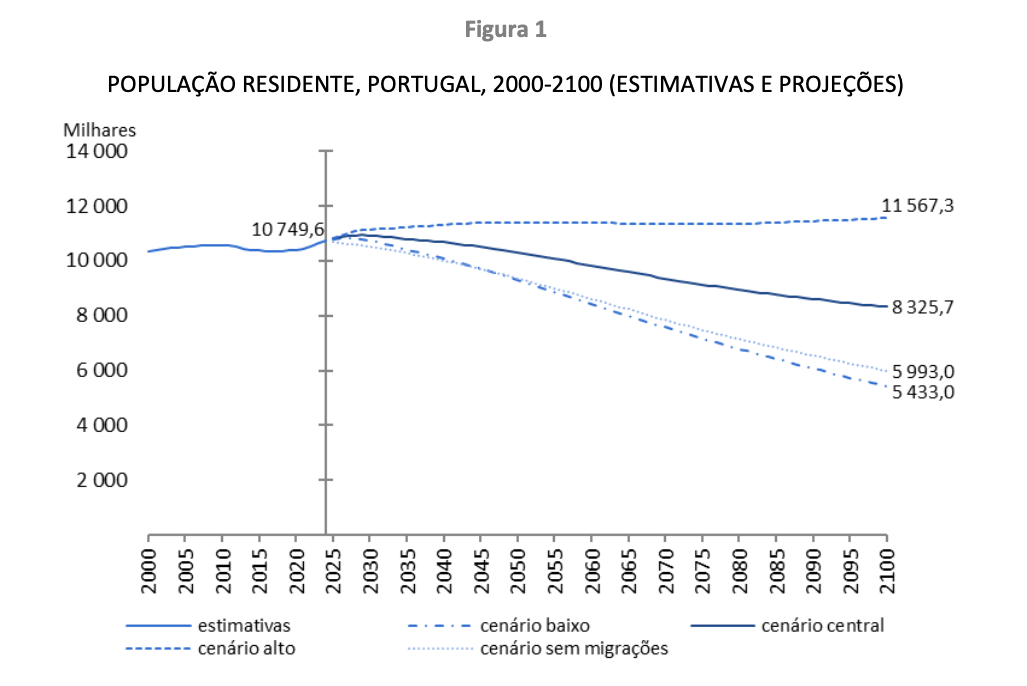 Observe que na página 3 do relatório há cenários projetando não apenas cidadãos, mas o número de pessoas residindo em Portugal. Mesmo no cenário mais "pessimista" (em que o fluxo migratório aumenta e a taxa de fecundidade aumenta) a população cresceria do atual 10,7 Milhões para 11.6 milhões até o ano de 2100.