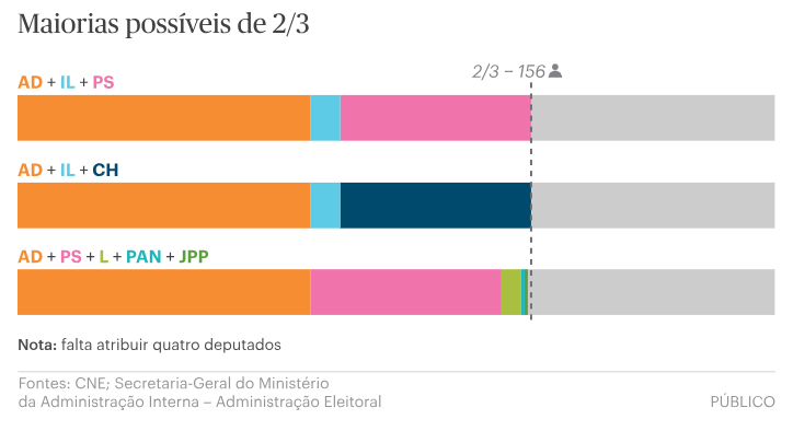 No fundo, e tal como o PÚBLICO avançou relativamente à governação, a AD admite aprovar medida a medida, tanto à esquerda como à direita. Uma revisão obriga à votação, na especialidade, artigo a artigo (sendo necessários dois terços em cada votação), e depois é precisa nova maioria de dois terços na votação final de todos os artigos.