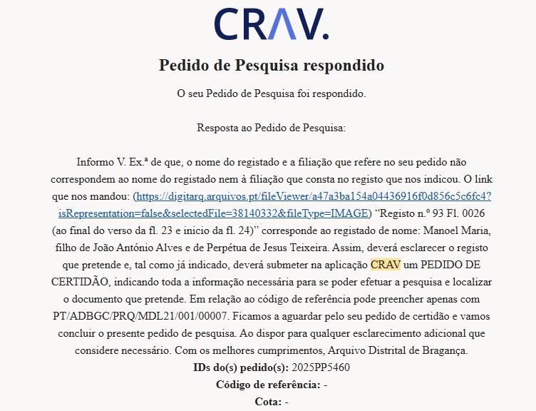 Recebi a resposta de vcs porém o CRAV informou que trata-se de documento de José Maria... Podem me ajudar?