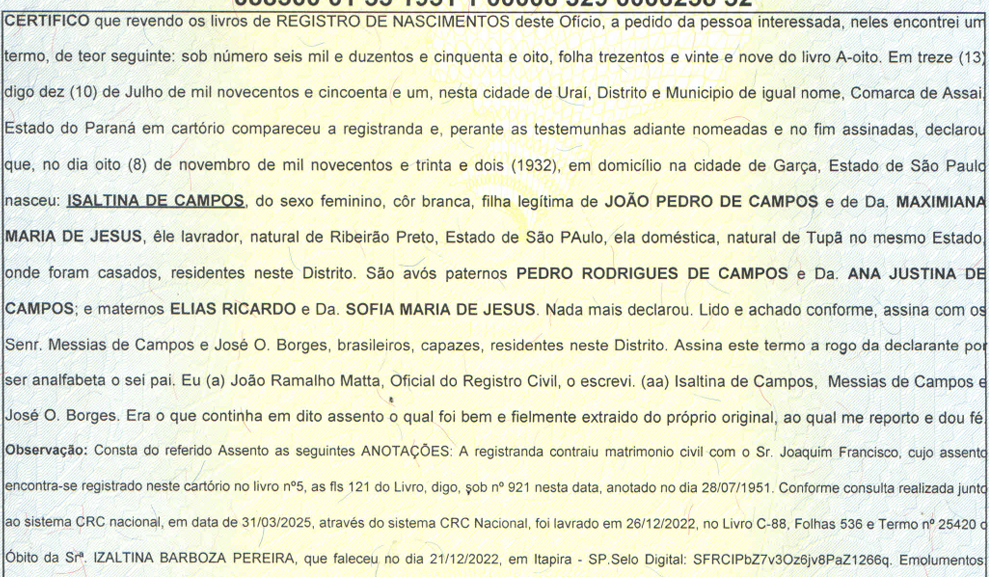 Eu soliciei a certidão de nascimento da minha avô para ter certeza qual os nomes dos meus bisavôs, constando João Pedro de Campos e Maximiana Maria de Jesus, segue abaixo a imagem: