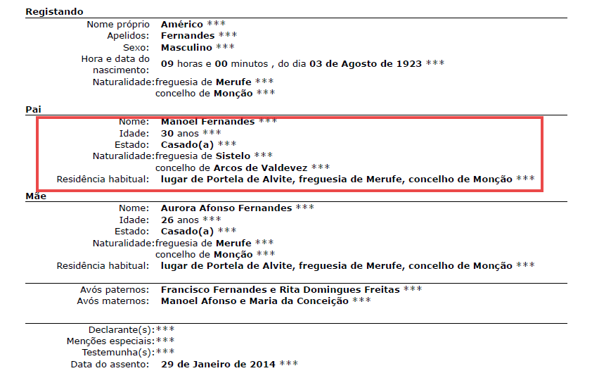 03/08/1923 - NASCIMENTO AMERICO FERNANDES (PT) - LOCAL: MERUFE, MONÇÃO, VIANA DO CASTELO, PORTUGAL