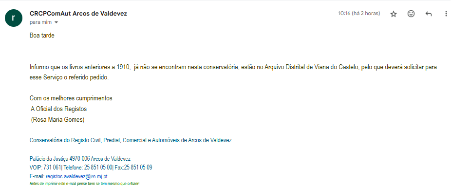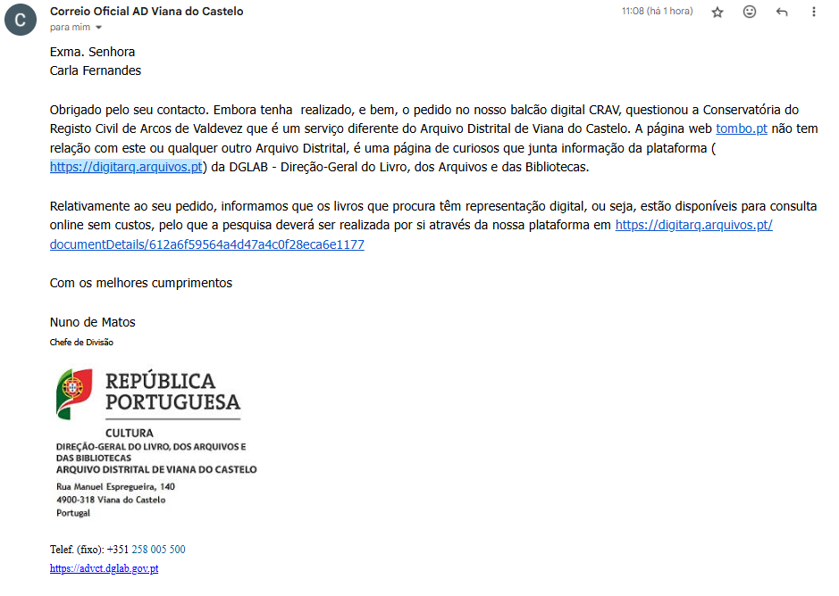 Falei também com a Torre do Tombo, solicitando sugestões, que retornou com as seguintes orientações sobre a certidão de batismo do meu avô: