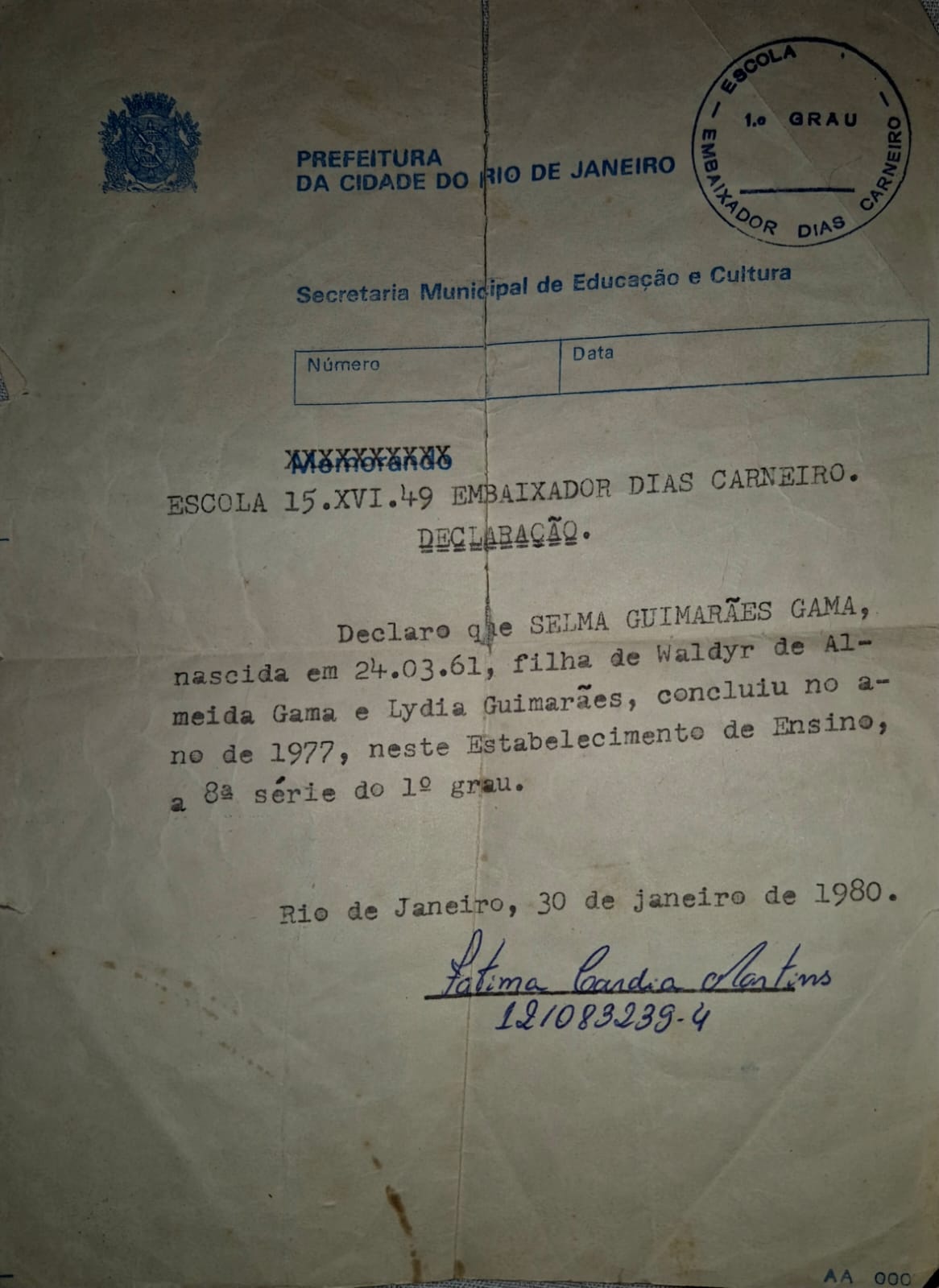 Possuo esta declaração escolar, indicando que a minha mãe finalizou o ensino médio em 1977 (enquanto ainda era menor de idade). Contudo, a declaração foi emitida em 1980, quando minha mãe já era maior de idade.