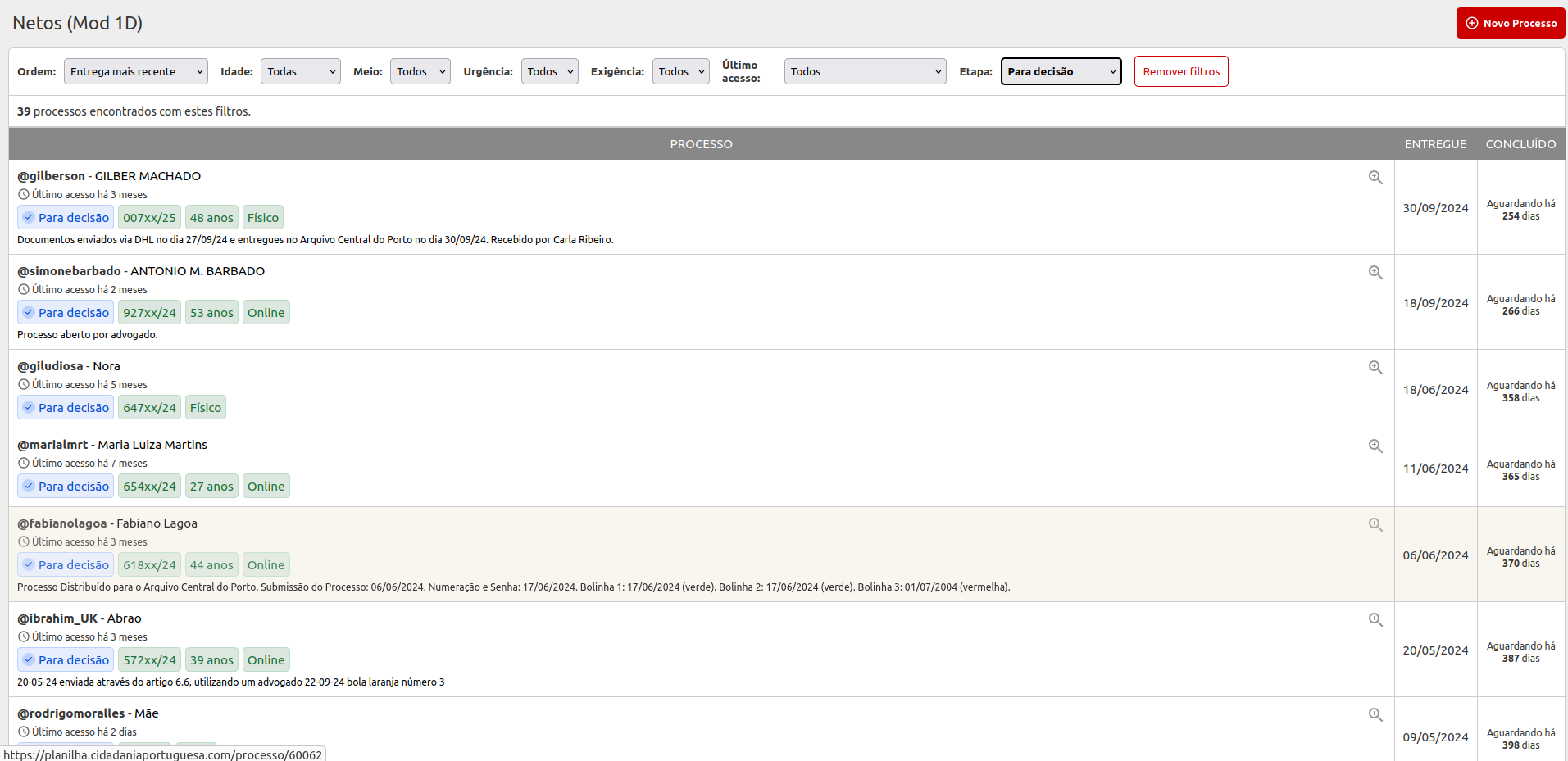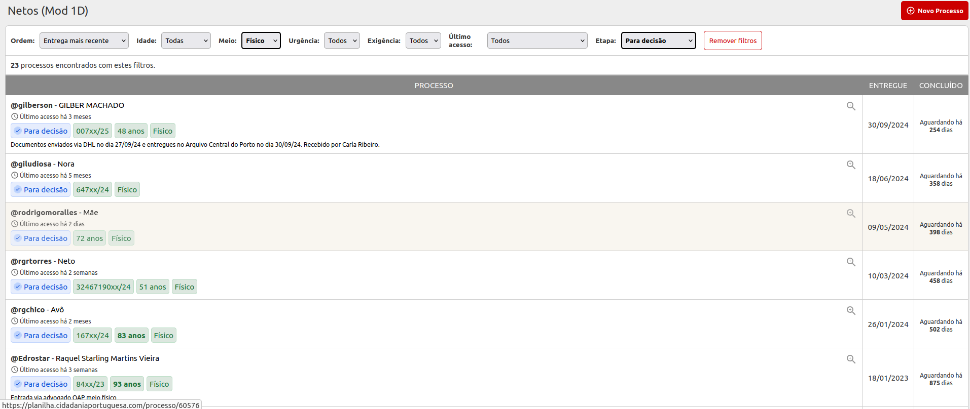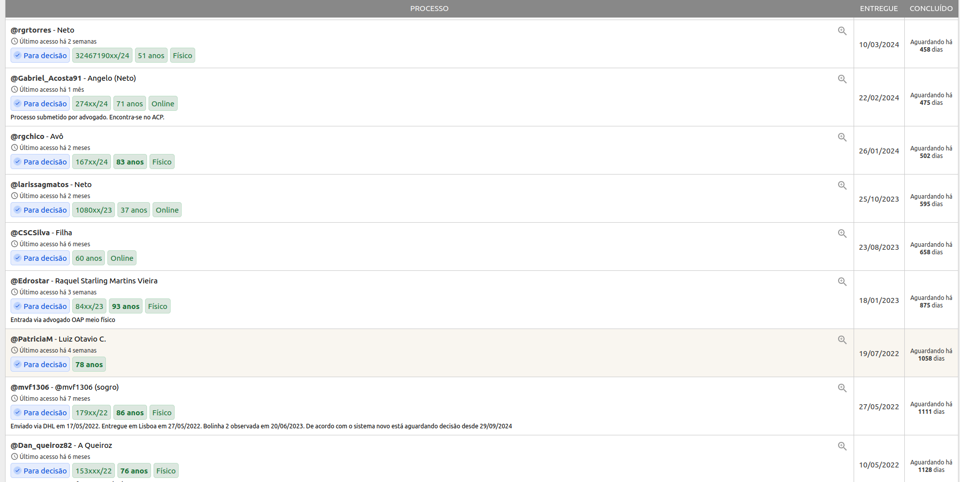 Deixo o print da tela da planilha de netos onde filtrei por entrega mais recente, processos físicos, e etapa "para decisão". Por favor, notem que não é o caso em que os processos sejam somente de menores de idade ou urgências.