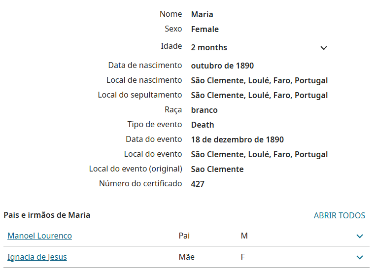 Para encontrar fiz a busca apenas pelo primeiro nome dele e o nome da mãe, limitando a Faro entre 1890 e 1892. Olha como está o registro no FamilySearch: