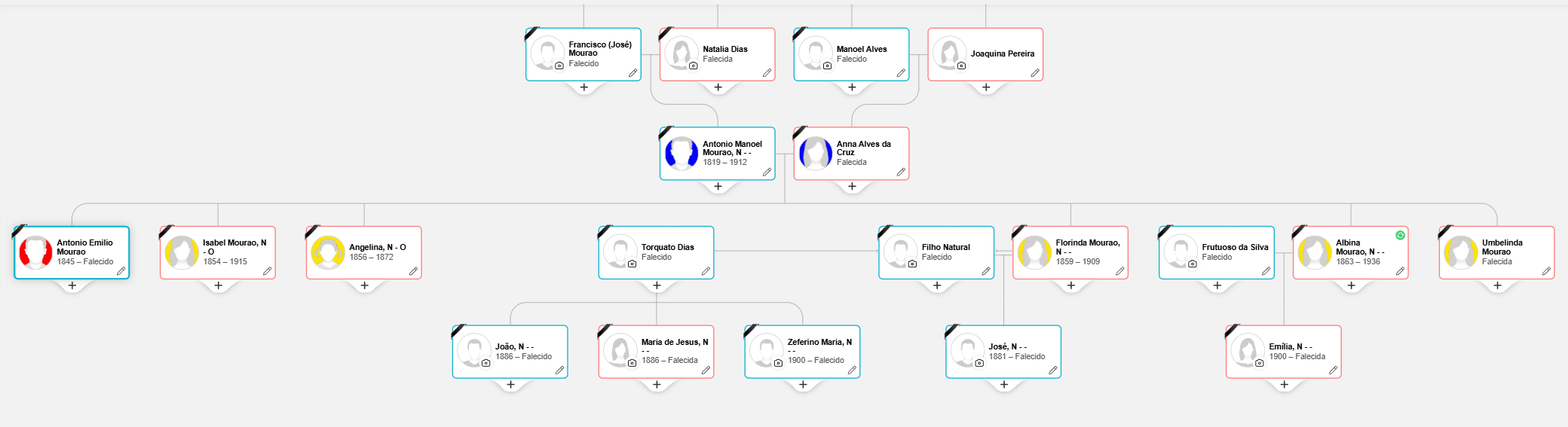 O óbito do meu trisavô Antonio Manoel Mourão é de 1912, em Cervos, Montalegre. Neste, deixou os filhos: Antonio, de 60 anos, ausente no Brasil (meu bisavô), Umbelinda (falecida, com filhos), Florinda (falecida, com filhos), Isabel com 45 anos e Albina com 40 anos. Estas informações também foram me passadas por esta pessoa anteirormente mencionada.