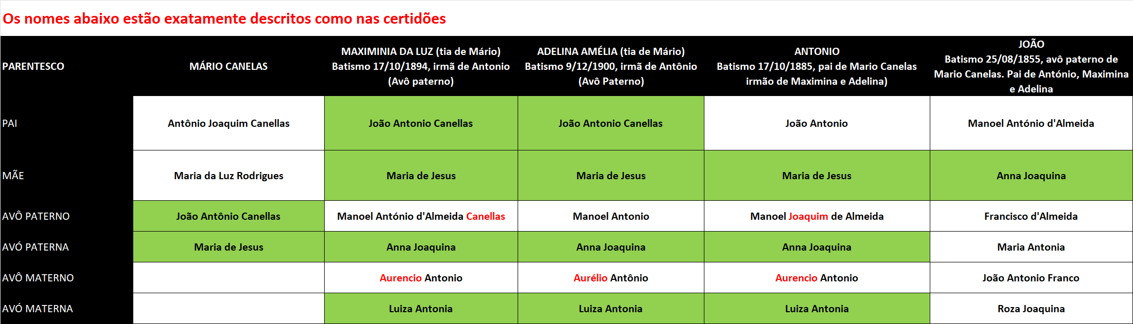 No entanto, ao cruzar os dados do batismo de Maria com o nascimento de seu filho Mário, surgiu uma divergência: o nome do pai de Maria (portanto, o avô materno de Mário) consta como Joaquim Rodrigues na certidão de nascimento de Mário, mas no batismo de Maria, em Portugal, consta Joaquim Rodrigo.