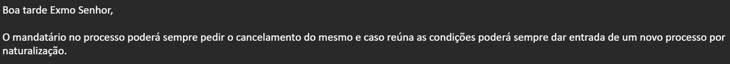 Outra coisa a fazer uma vez que o Slaingerz ir até a conservatória e indagar se é possível com o cancelamento e apresentação de novo processo conseguir o ressarcimento por ele memo. E também perguntar para ter certeza se não é possível a conversão enviando novo formulário , atestados criminais e diferênça da taxa. É preciso ver como fica o caso da advogada que já não faz mais parte do processo, ver como se pode tirar o nome dela, caso ainda conste no processo. O que acham @LeoSantos @eduardo_augusto