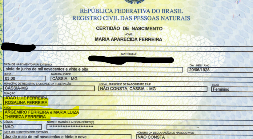 Estou tentando encontrar algum registro de casamento entre Rosalina Ferreira e João Luiz Ferreira. No entanto, em uma das certidões de nascimento do primeiro neto deles (meu tio), o nome do João Luiz aparece como João Luiz de Oliveira — o que pode ser uma variação ou o nome correto.