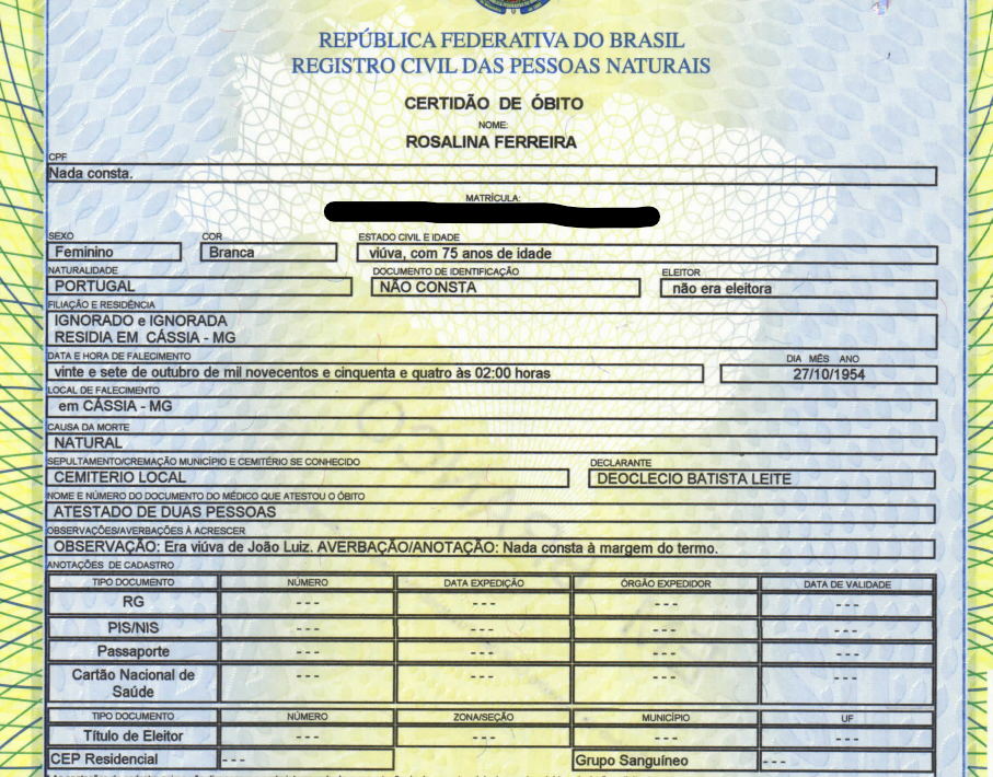 No Brasil, ela se casou, teve filhos e viveu até falecer — eu tenho apenas a certidão de óbito brasileira, mas ela contém pouquíssimas informações úteis para rastreio em Portugal.