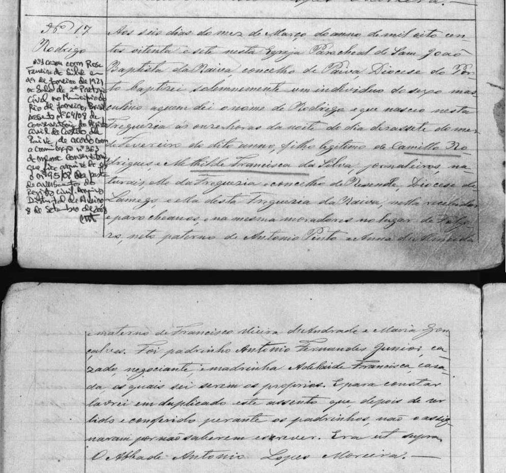 Informo ainda que, na certidão de nascimento emitido por cópia reprográfica de Franscisco Ferreira, filho do português, consta a naturalidade de Rodrigo (português) como brasileiro.