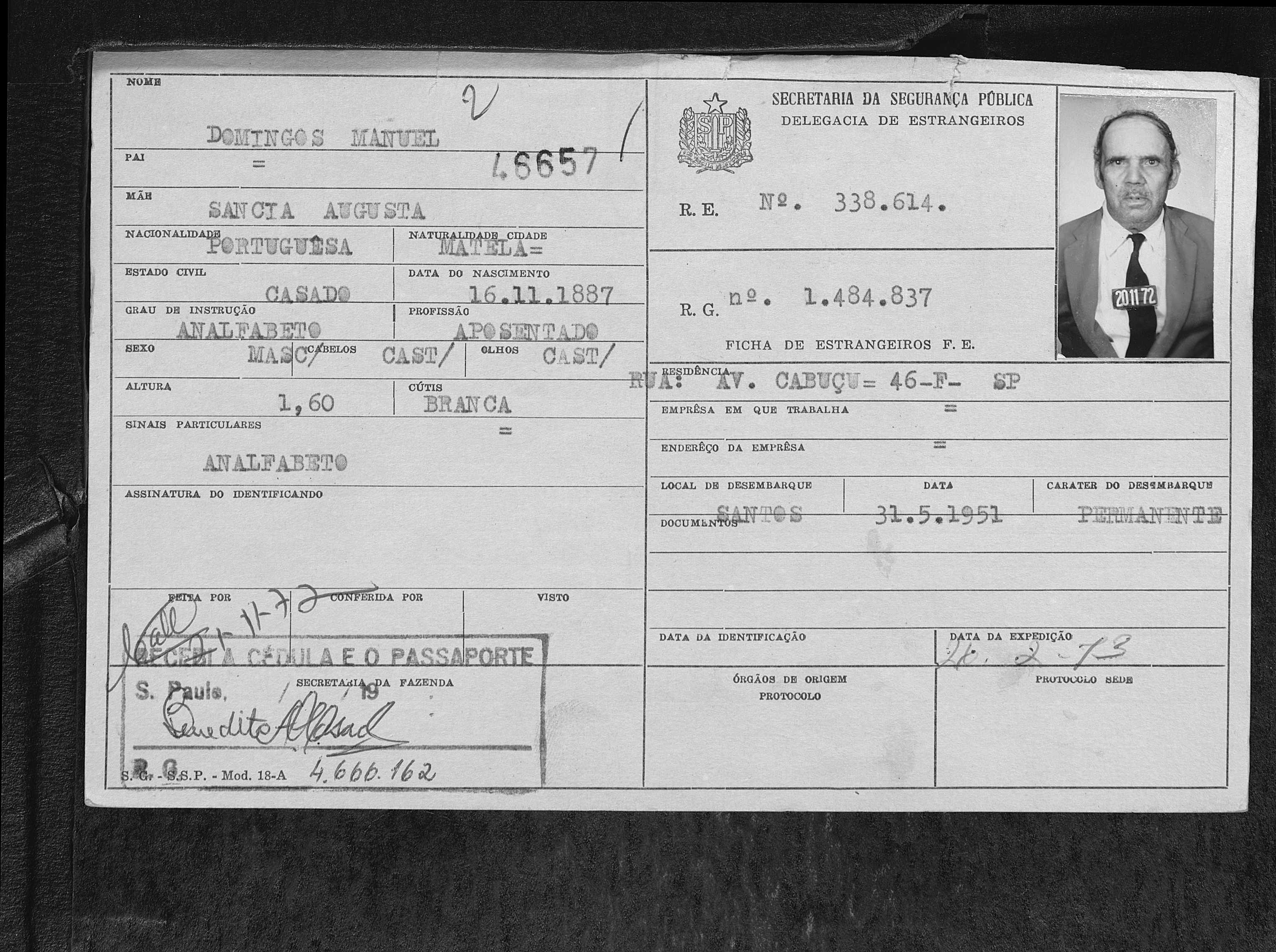 Desembarque em 31/05/1951 no Porto de Santos no navio Serpa Pinto.