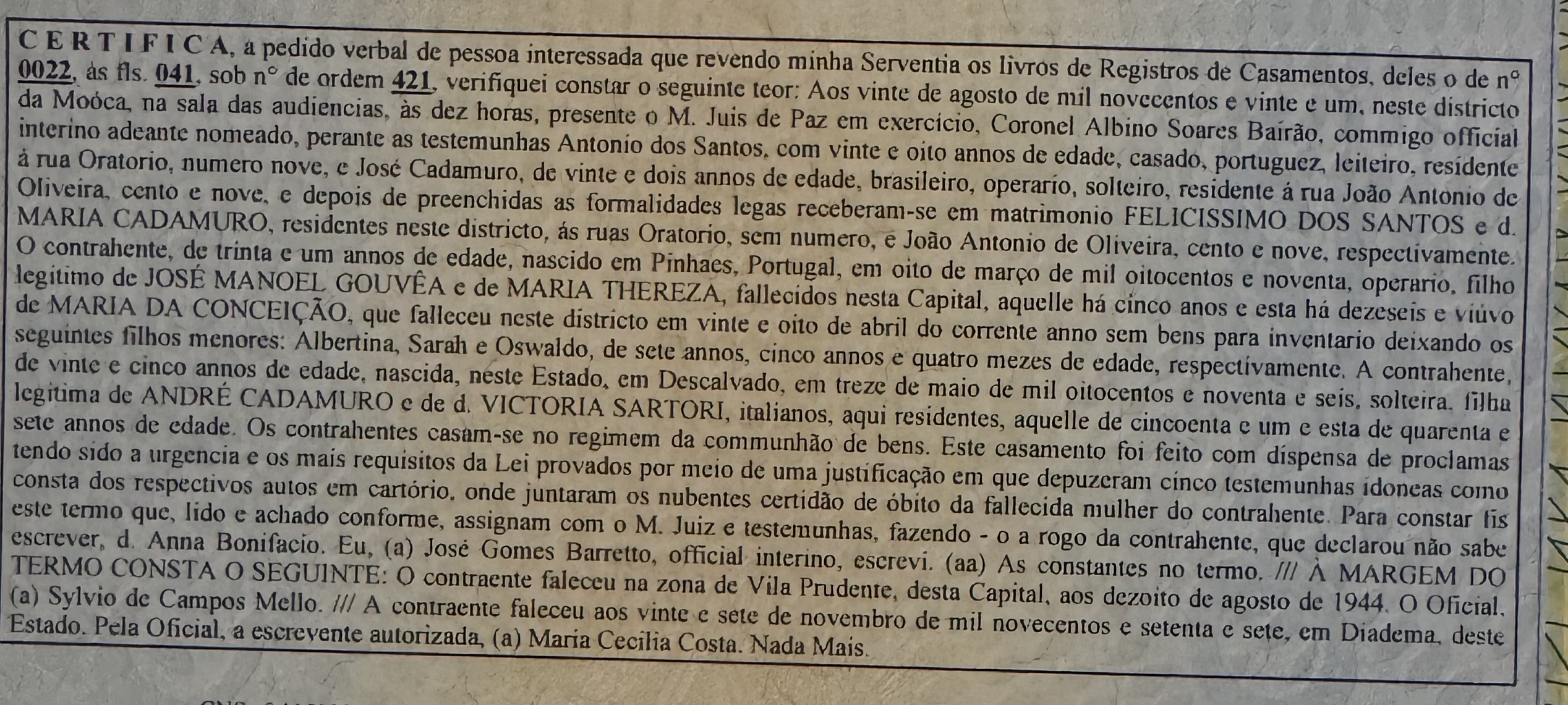 Tem o batismo de um Jesualdo, filho de Felicissimo e da Maria da Conceição que diz que nasceu em 25/04/1921 na "Rua do Oratorio". Esse batismo diz que os pais não se casaram no religioso, apenas no civil: