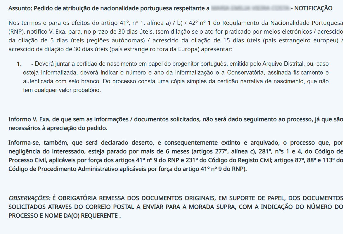 Ontem dei uma olhada no pedido de atribuição de nacionalidade portuguesa 1C da minha mãe e vi que recebi esta resposta da imagem abaixo.