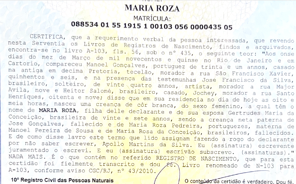 Minha bisavó, Maria Rosa (Maria Roza) Gonçalves nasceu em 1915 na região da Tijuca. É filha de Manoel Gonçalves, português, e Gertrudes Maria da Conceição, brasileira. Ela tem uma irmã mais velha, que se chama Antonieta e nasceu em setembro de 1912.