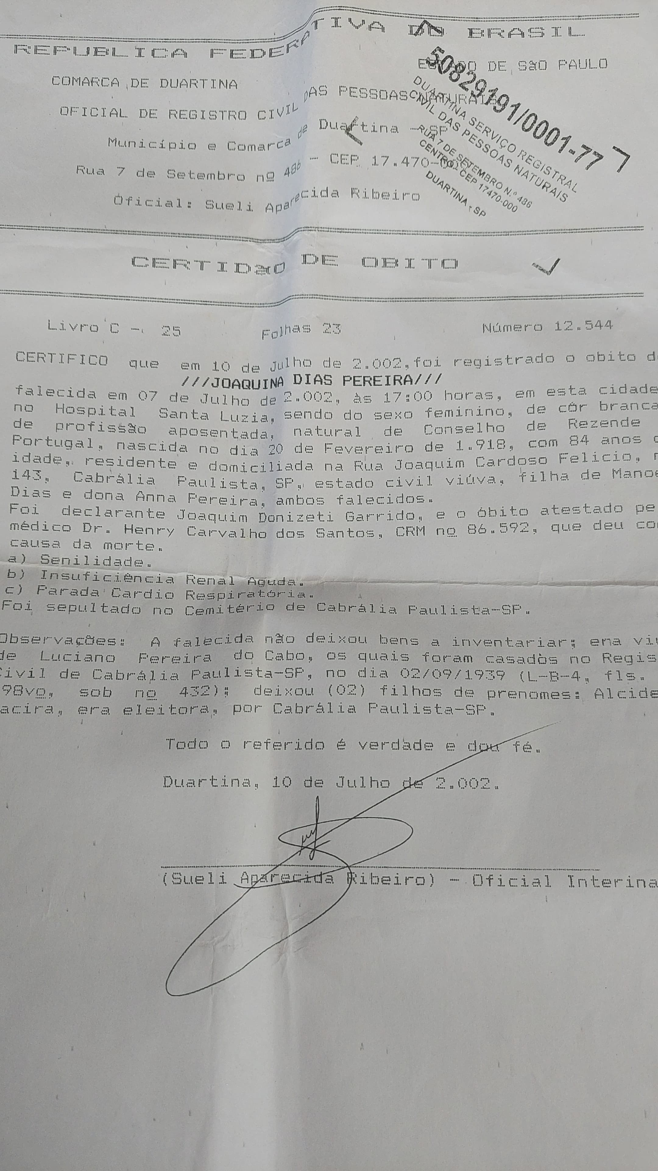 Filiação: MANOEL DIAS (Pai) e ANNA PEREIRA (Mãe)