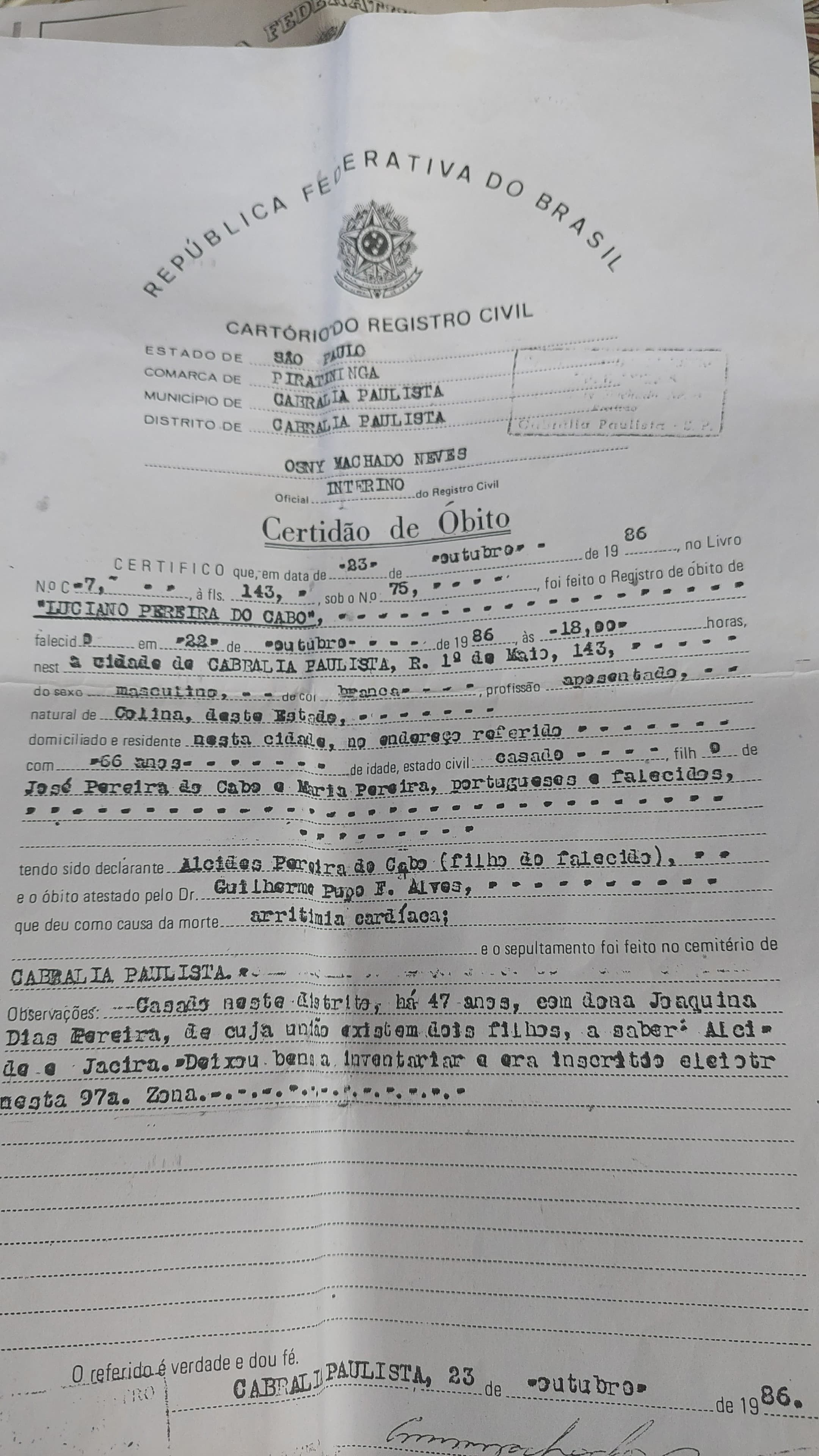 No brasil se casou e teve dois filhos, minha avó (JACIRA PEREIRA DO CABO) mãe da minha mãe e seu irmão. (ALCIDES PEREIRA DO CABO)