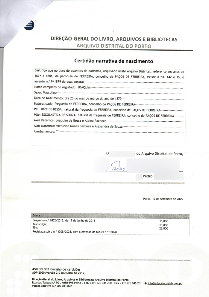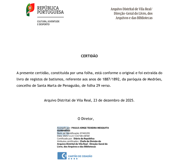 - Já emiti o assento de nascimento da minha bisavó portuguesa pelo arquivo distrital