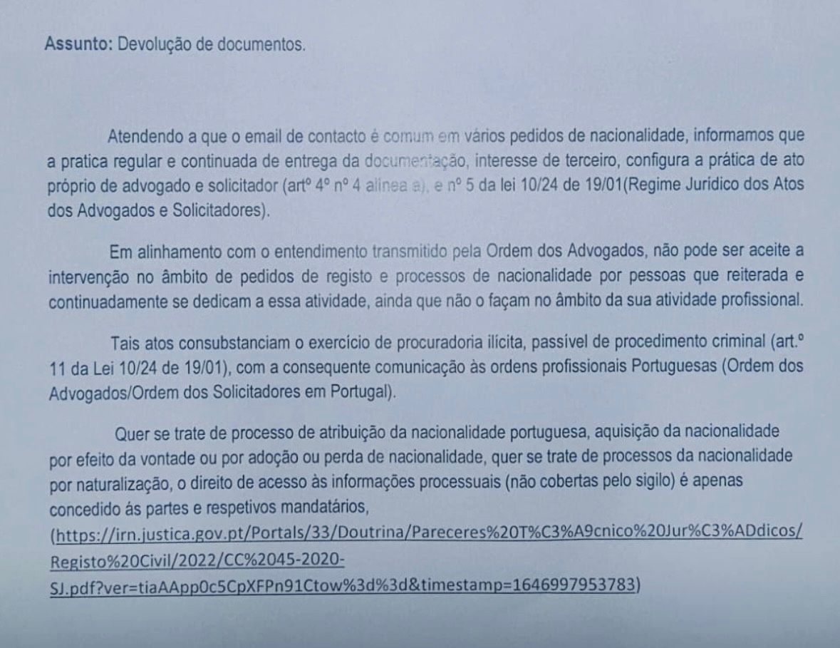 Gente, fui me informar. No caso em novembro de 2023 foram enviados 4 pedidos de nacionalidade de neto, sendo da mãe desse meu primo e de 3 tias, sendo que cada uma com seus documentos, porém compartilharam esse e-mail criado por ele. Todas as pastas foram recebidas normalmente e emitido número de processo, até aí ok. No ano de 2024 mais 2 filhos dessa mesma família fizeram o pedido e utilizaram o e-mail dessde grupo, foi tramitado já o processo e encerrado. Até aí ok, Podemos ver que são todos familiares. No ano agora final de 2025 meu primo enviou o dele de neto, porém por parte da família do pai dele, e utilizou esse mesmo e-mail. Foi aí que deu problema. Acho que quando são todos da mesma família e enviam juntos, não tem problema. Vou enviar aqui foto da carta que chegou junto com todos os documentos devolvidos! Não abriram processo para ele, devolveram tudo! Complicada essa situação, pq eles não tiveram auxílio de profissional, foram eles mesmo que foram atrás de tudo, no caso apenas compartilharam o e-mail e isso nunca foi falado que era proibido. Agora tá todos eles preocupados, inclusive a mãe deles e a tia que já estão há 02 anos na fila de espera!