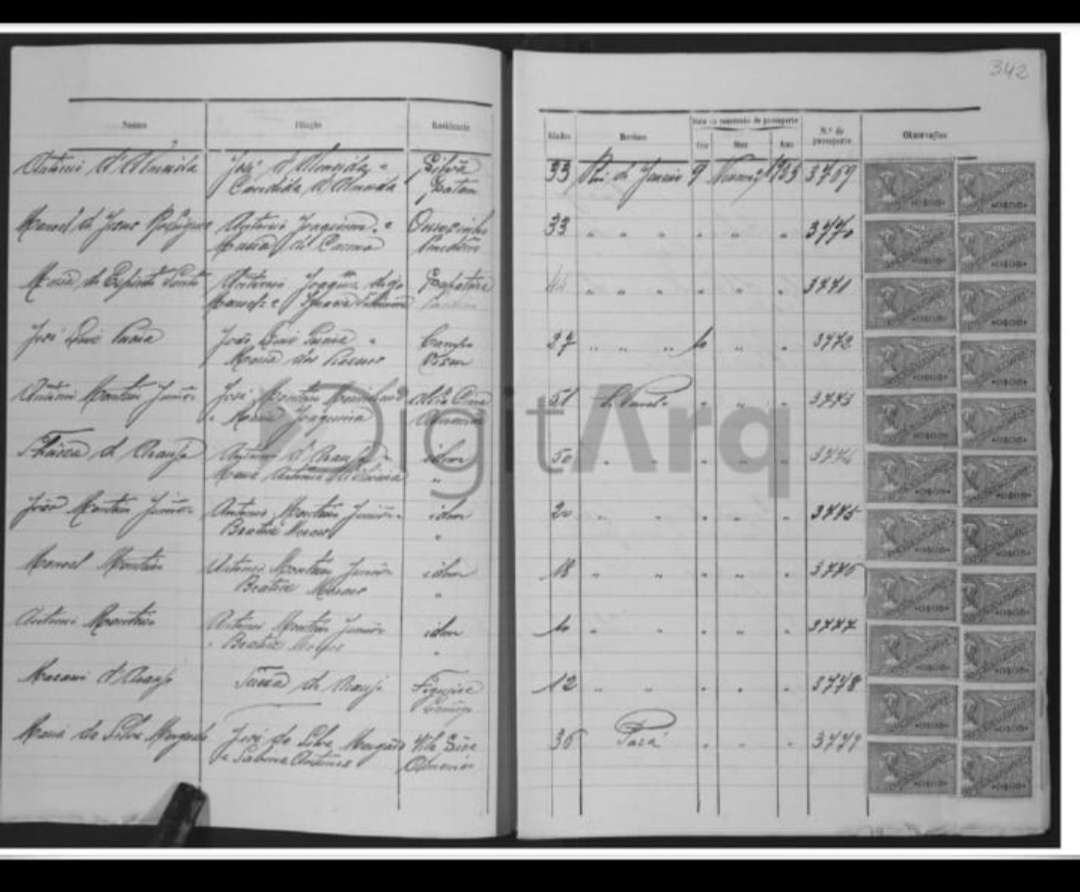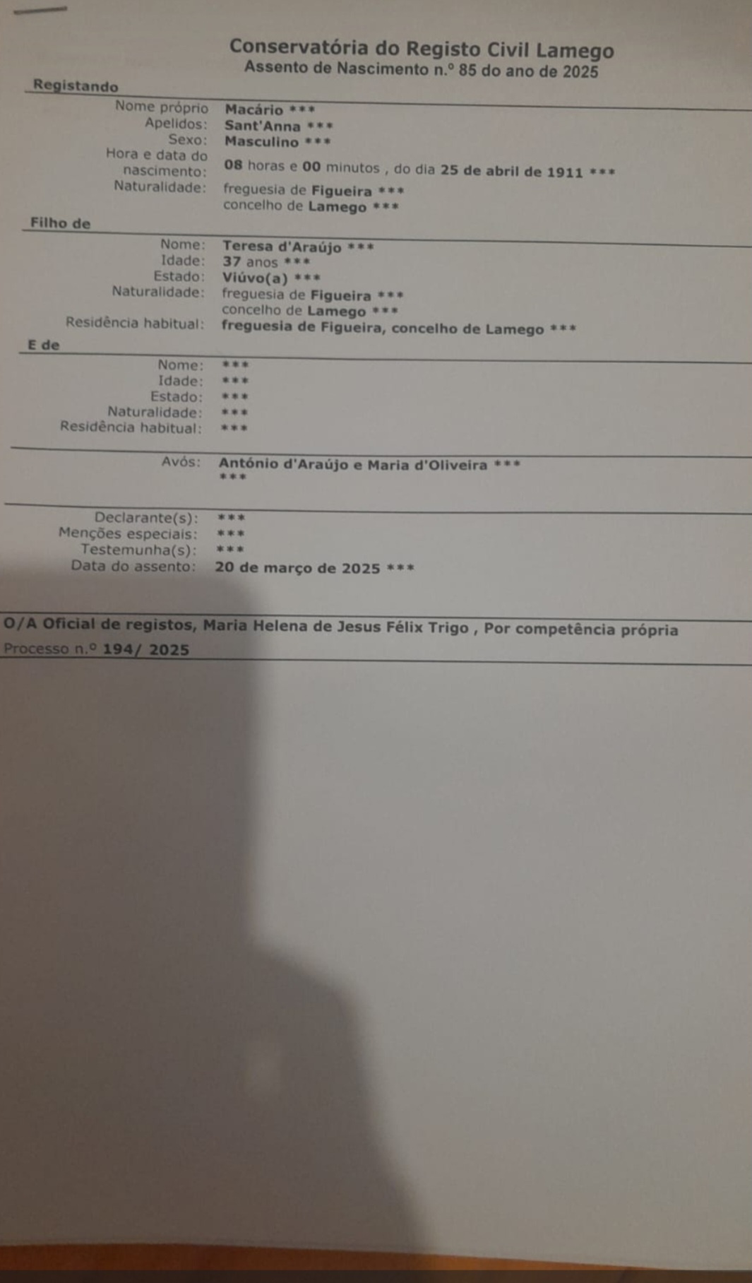 Localizamos a certidão de nascimento do meu avô Macário Sant'Anna, filho de Teresa araujo e Manuel Sant'Anna. Mas, no Brasil meu avô nunca assinou o nome corretamente, ele assinou em todos documentos Macário Araújo, nome inexistente.