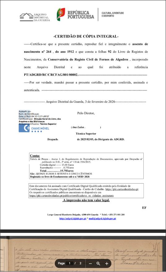 Obtivemos, com o Arquivo Distrital da Guarda, a certidão integral por fotocópia de reprodução digital, que segue em anexo, mas restou a dúvida sobre a sua validade, pois ao final da certidão, consta:  A impressão não tem valor legal, mas como consta na imagem abaixo, mas como extraído do endereço site do MJ português para nacionalidade de filhos, ela até poderia ser dispensada se os dados necessários fossem identificados e, sim, todos os dados necessários constam na certidão em anexo.