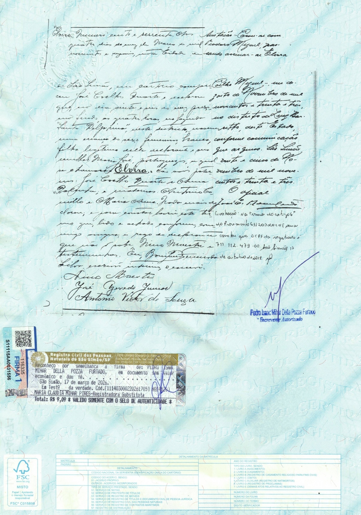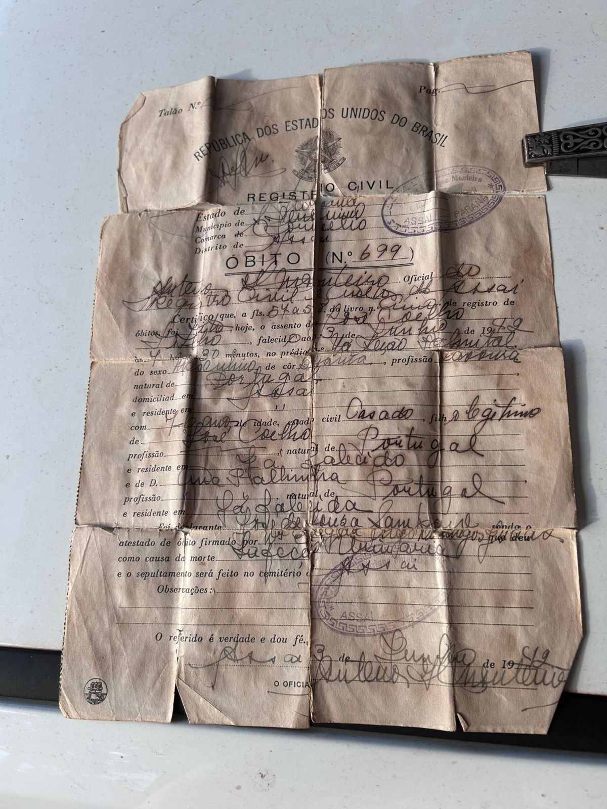 Agora, estou correndo atrás para tirar a do meu pai, mas tenho pouquíssimas informações e documentos , visto a exigência de documentos portugueses. O que eu consegui encontrar de informações foram esses dois documentos, a certidão de nascimento da minha avó e o atestado de óbito do meu bisavô.