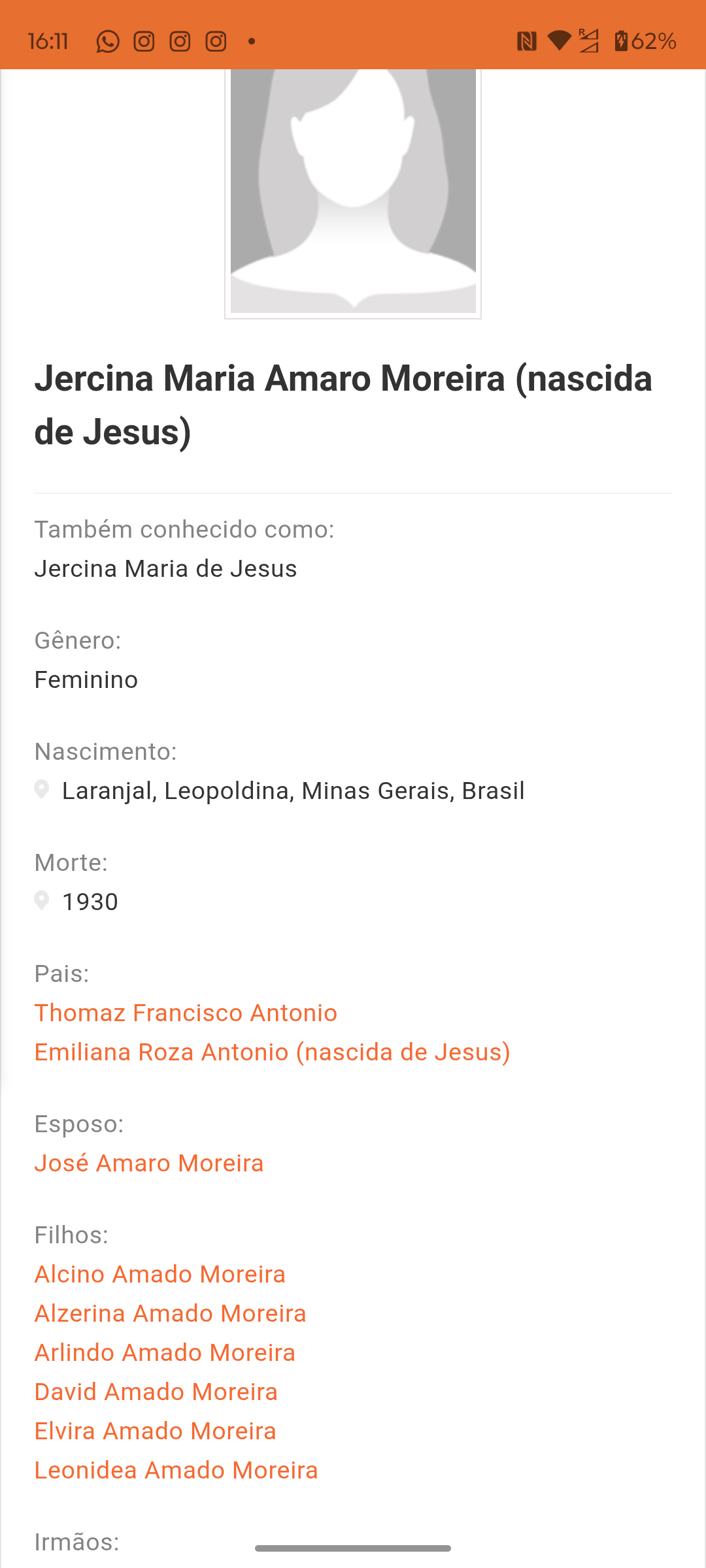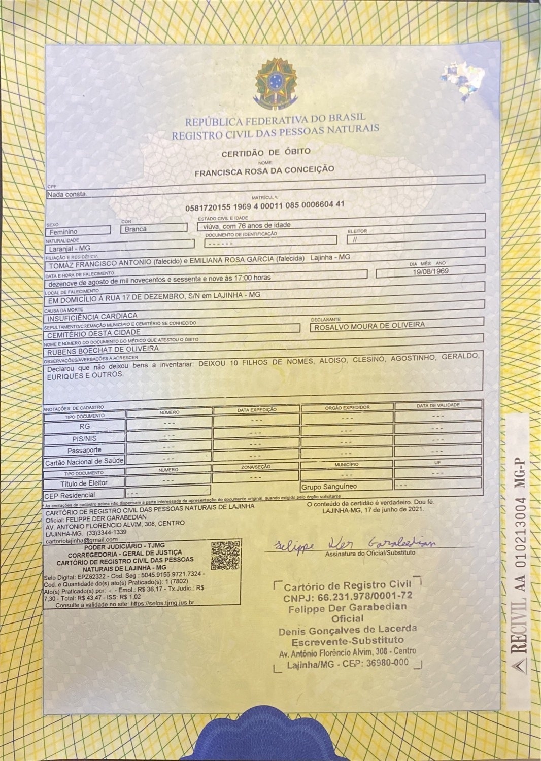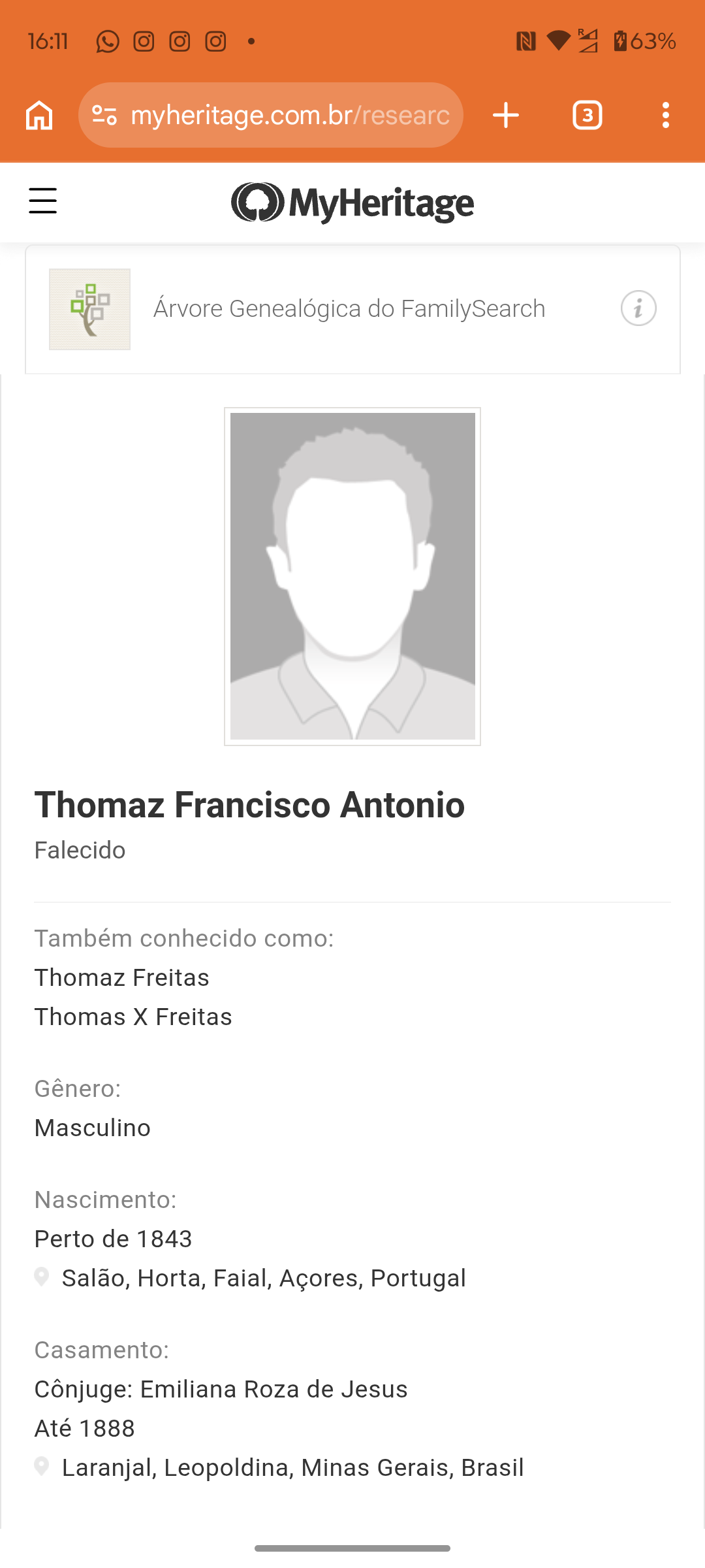 Fala pessoal beleza estou pegando a minha árvore genealógica e estou em busca das certidões de Thomaz Francisco Antônio nascido em Portugal ilha faial Açores em torno de 1943 filho de André Francisco Antônio e Maria Rosa de Jesus estou indo pela linhagem da mãe do meu avô que é Jacira Maria de Jesus o Thomas é a 1 linhagem que nasceu em Portugal depois a Jacira já nasceu em minas,Thomas morreu em lajinha Minas gerais provavelmente,quem puder me ajudar,essa certidão é de outra filha de Thomaz aonde Costa o nome do Thomas e da Maria