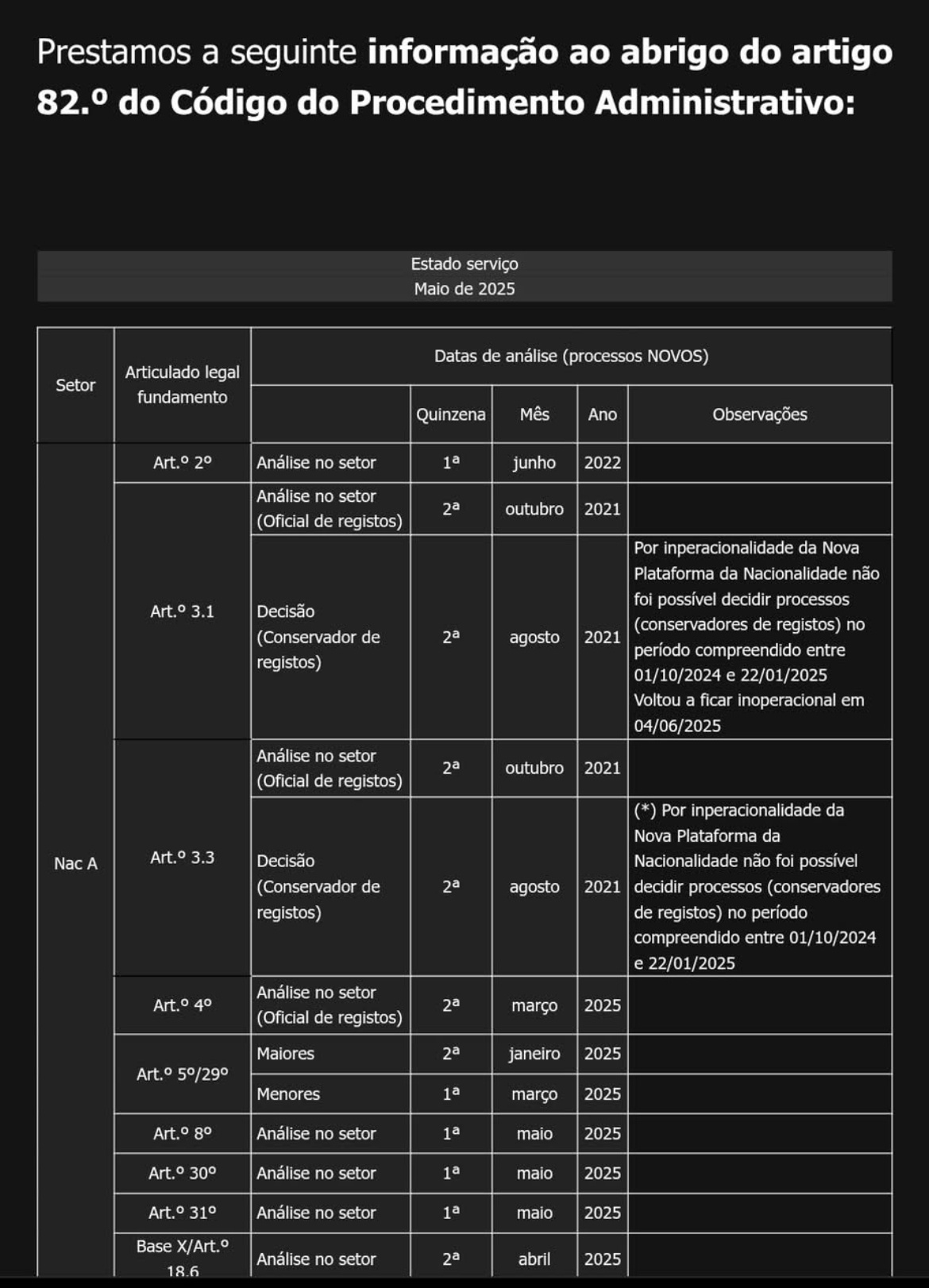 Concordo com a @texaslady. Também achei essa atualização muito esclarecedora, por 3 motivos: 1o) Finalmente, forneceram uma tabela separando as datas de análise pelo Oficial de Registro e de decisão pelo Conservador (isso ao menos ajuda em compreender como eles estão operando); 2o) Finalmente, forneceram alguma informação oficial para os problemas na Plataforma de Nacionalidade (parece que tentaram juntar vários programas distintos nessa única plataforma, , sem sucesso) ; 3o) Não informaram que esse tipo de problema tenha impedido a análise pelos oficiais de registro (quando o @Destefano nos deu aquelas datas de inoperância, eu havia suposto o contrário).