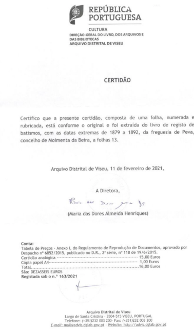 Esse é o problema. Não sei exatamente onde vc solicitou essa certidão ou quem te enviou, mas você precisa fornecer uma certidão original, em papel com a assinatura do responsável pelo livro e com carimbo em relevo. Use o guia abaixo para solicitar pelo CRAV direto ao Arquivo Distrital de Viseu. Quando receber o documento, junte com a outra certidão solicitada e envie por correio registrado e guarde a confirmação de entrega.