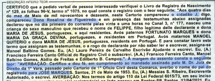 @texaslady entendo, perfeito. Vou esclarecer alguns pontos, na certidão de casamento sim o nome do português está indicado corretamente. Na certidão de nascimento do meu avô os avós paternos também estão corretos. O casamento deles foi feito em Portugal antes do nascimento do meu avô, e também foi enviado como prova, em anexo mostrarei o erro ocorrido e também a averbação o qual foi pedido cópia do mandado.o erro foi mencionar o nome de uma tal rosalina, mesmo assim indicando os avós paternos corretamente, indicando ser ele filho de José Marques, conforme também comprova pelo assento de casamento dos portugueses.