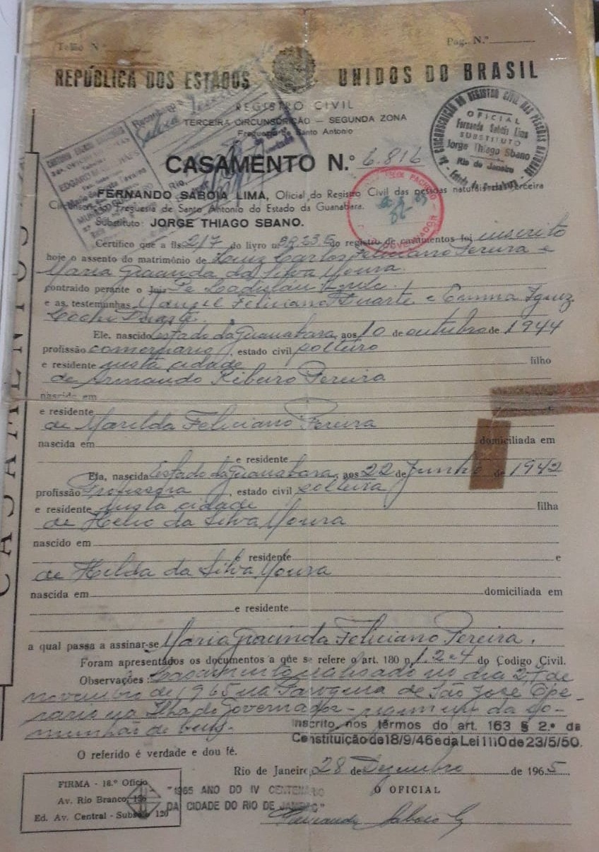 A paroquia do casamento religioso (Paroquia de são José Operário) informou que “Esses dados constam na habilitação civil que consta no processo religioso - Oficial de Registro Civil das Pessoas Naturais da 3ª Circunscrição - Freguesia de Santo Antonio do Estado da Guanabara - Oficial Fernando Saboia Lima. Nº do processo 17.404 - Regime de Comunhão de Bens, datado de 11/11/1965”