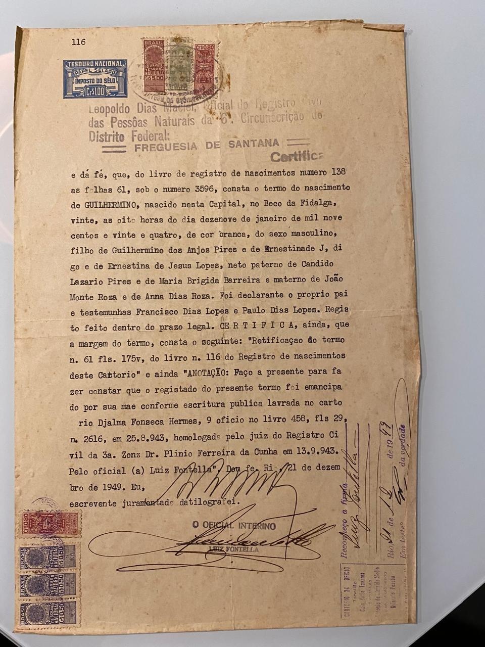 Mas acho que não expliquei corretamente e submeti faltando alguns documentos que tenho. Essa é a certidão do meu pai Guilhermino que tem o mesmo nome do meu avô. Vou submeter outros documentos que encontrei!